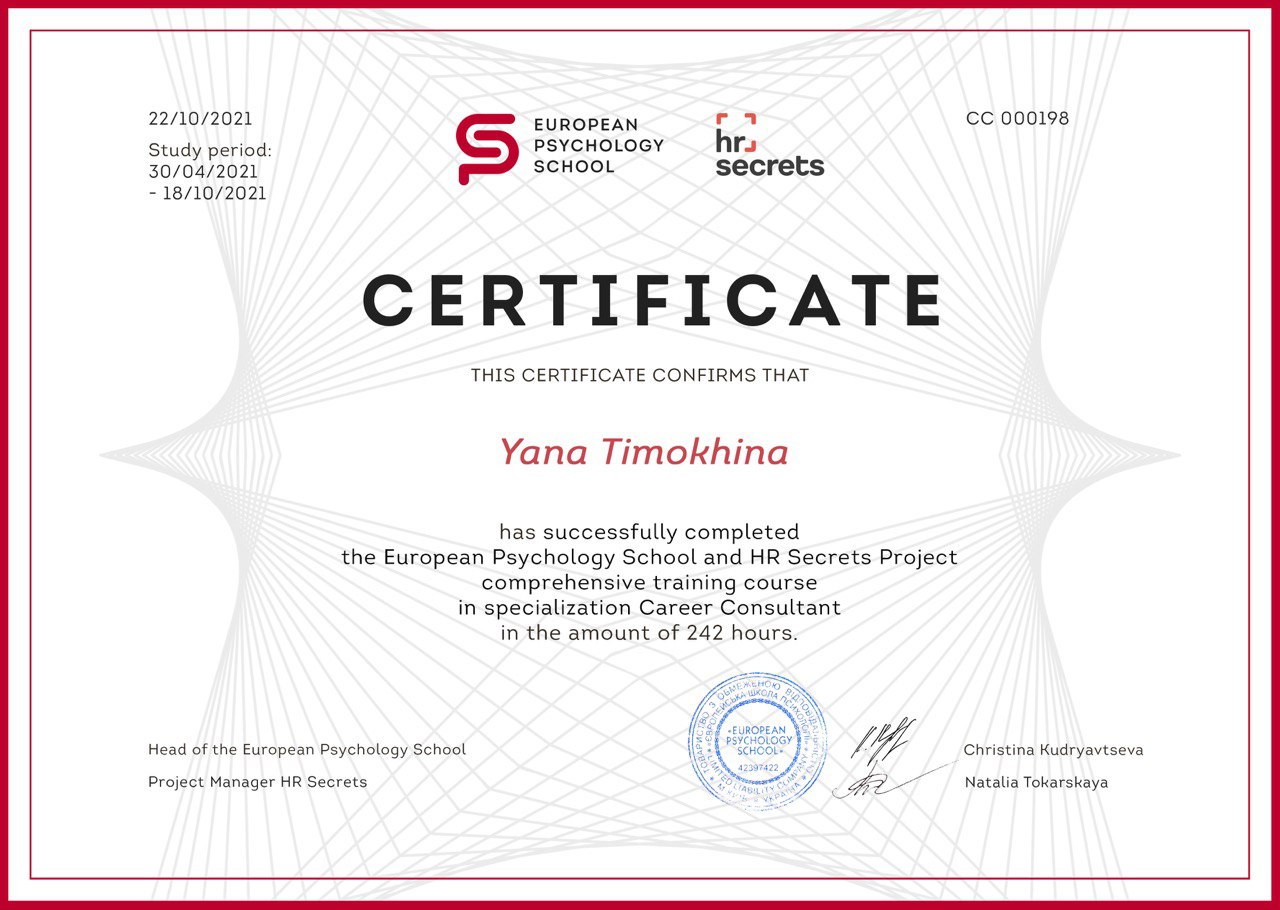 Очень рекомендую такие карьерные консультации! Они дают моральную поддержку и уверенность в себе, а также предоставляют конкретные инструменты и решения, специально подобранные под ваш случай.